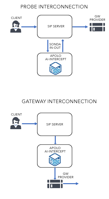 Apolo-AI can integrate with any telecommunications architecture over SIP protocol. It works as a system that is interspersed between centers or platforms to perform interception and analysis functions. The connection can be made as a local probe on any node or simply as an intermediate node between the caller and the terminating Gateway.